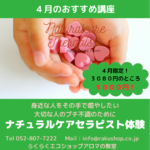 4月 4, 2023 / 最終更新日時 : 3月 27, 2025 ns62849 お知らせ・記事 【終了しました】4月のお勧めも先月に引き続き ナチュラルケアセラピスト体験です! 3月は、ナチュラルケアセラピストの体験講座をおすすめとしました。たくさんの方にご受講いただきありがとうございました!本講座もとても人気をいただいております。 4月は、環境の変化で、色々ストレスも溜まりやすい時。 なので、 […]