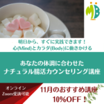 11月 6, 2023 / 最終更新日時 : 3月 27, 2025 ns62849 お知らせ・記事 【終了しました】11月のおすすめ講座はMBナチュラル腸活講座です。 毎回大好評の「MB(マインド&ボディ)ナチュラル腸活講座」たくさんの方にご受講いただき、 「講座を受けて、一度食卓を見直してみようというきっかけになった!」「すごい内容とボリュームでお得感満載です」「テキストがわかりやす […]