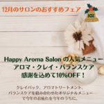 12月 2, 2023 / 最終更新日時 : 3月 27, 2025 ns62849 お知らせ・記事 【終了しました】12月のおすすめはサロンメニュー。アロマ・クレイ・バランスケアを10%OFFで受けていただけます! 12月のおすすめは講座ではなくてトリートメントです。 スタート以来、人気のメニューとなっているアロマ・クレイ・バランスケア。クレイで老廃物をとり、アロマでトリートメント、MBナチュラルケアでストレスケアと全身のバランスを […]