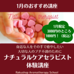 1月 5, 2024 / 最終更新日時 : 3月 27, 2025 ns62849 お知らせ・記事 【終了しました!】1月のお勧め講座は「ナチュラルケアセラピスト体験講座」です。 新春1月は、好評、ナチュラルケアセラピスト体験講座をおすすめ講座といたします。 身近な方のストレスや、肩こり、寝付きが悪い、などのプチ不調を その手で癒やしてあげられたら・・・と思うことはありませんか? ナチュラルケアセ […]