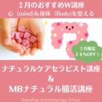 2月 1, 2024 / 最終更新日時 : 3月 27, 2025 ns62849 お知らせ・記事 【終了しました!】2月のお勧め講座はダブルでご用意しました!「ナチュラルケアセラピスト講座」&「MBナチュラル腸活カウンセリング講座」です。 2月のおすすめ講座は初の試み、ダブルでご用意しました ひとつめは ■「ナチュラルケアセラピスト講座」 身近な方のストレスや、肩こり、寝付きが悪い、などのプチ不調を その手で癒やしてあげられたら・・・と思うことはありません […]