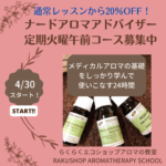 3月 19, 2024 / 最終更新日時 : 3月 27, 2025 ns62849 お知らせ・記事 【募集締め切り・次回は秋(9月の予定です】受講料が20%OFFになるNARD(ナード)アロマアドバイザー講座4月30日スタート!定期火曜日午前コース 受講生様募集中です。 コロナ前に開催していた、受講料がお得になるナードアロマアドバイザー講座の定期コースを再開します!定期コースは、授業や、実習の内容は全く同じなのに、受講日を決めさせていただいている分、自由レッスンよりも受講料を20%OFF […]