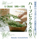 5月 19, 2025 / 最終更新日時 : 5月 19, 2025 ns62849 新着情報 5/28ハーブピクルスづくりワークショップを開催します。 らくエコのハーブが今とっても元気ですので、このハーブ(ローズマリー、タイム、オレガノなどなど) を摘んで、少し大人のハーブピクルスをご一緒に作りませんか? 作ったピクルスは瓶詰めでお持ち帰りいただき、おうちでお楽しみくだ […]