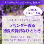 6月 13, 2025 / 最終更新日時 : 7月 2, 2025 ns62849 新着情報 ★★満席★★ 7/10 「ラベンダー香る初夏の贅沢なひととき」らくエコアロマクラブ開催します。 7月は、72回目のアロマクラブ。ラベンダーを愉しむアロマクラブを開催します。 富良野ラベンダーを蒸留しながらラベンダーの6種をテイスティング、また、香りの比較だけでなく成分からも見て、6種を使い方も徹底比較します。お好き […]