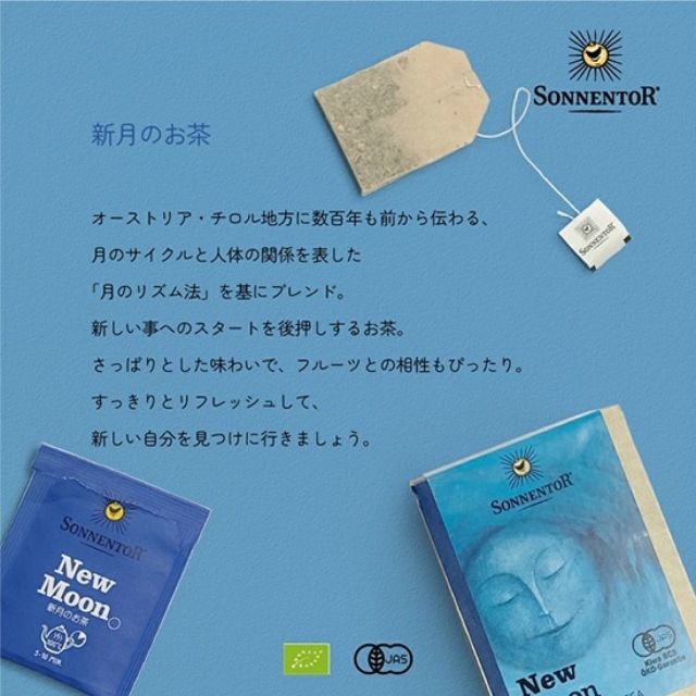 月の満ち欠けに想いをはせて、お召し上がりいただきたいシリーズです。 新しい事へのスタートを後押しするお茶。 さっぱりとした味わいで、フルーツにもぴったり。 すっきりとリフレッシュして、新しい自分を見つけにゆきましょう。 新月の2、3日前から当日までお飲みください。
