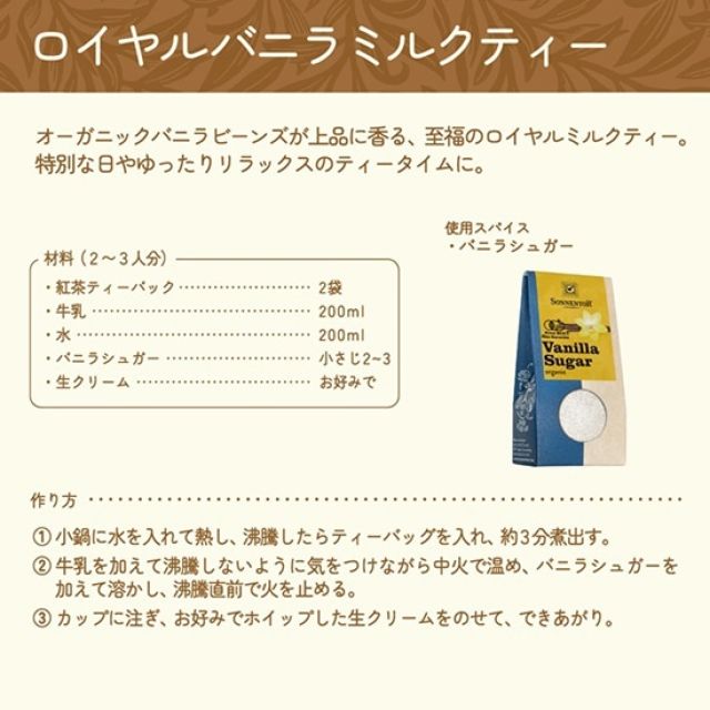 有機バニラビーンズと有機甜菜糖をブレンドした上品な甘さ。 クリーム、アイス、ミルクティーなど、至福の時間を満喫したいときに。