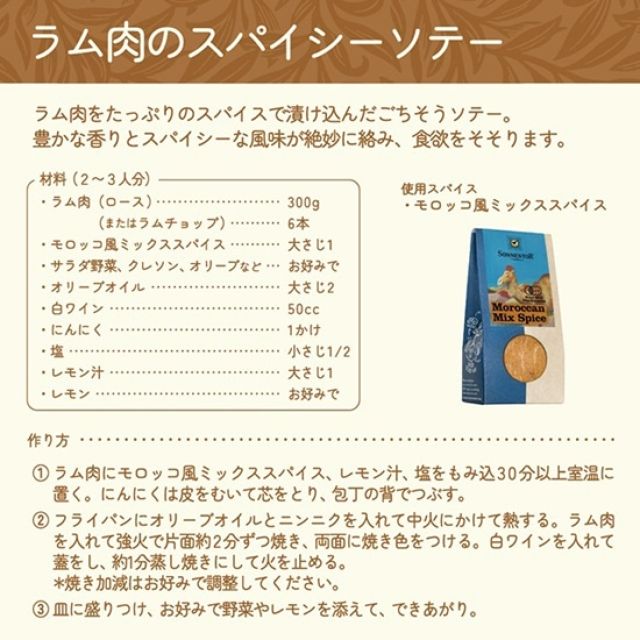 モロッコのマーケットに並ぶ色とりどりのスパイスをイメージしたブレンド。 16種類ものスパイスやハーブが、素材の味を引き出します。 肉料理や豆料理、クスクスにもおすすめ。